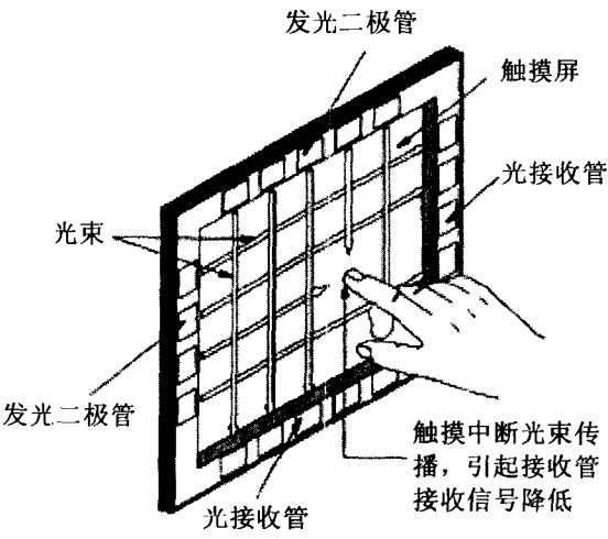 ? 紅外多點觸摸屏是利用X、Y方向上密布的紅外線矩陣來檢測并定位人的觸摸手勢的電子設備。紅外觸摸屏在顯示器的前面安裝個電路板外框,電路板在屏幕四邊排布紅外發射管和紅外接收管對應形成橫豎交叉的紅外線矩陣。手指在觸摸屏幕時,就會擋住經過該位置的橫豎兩條紅外線,因而可以判斷出觸摸點在屏幕的坐標位置。任何非透明物體都可改變觸點上的紅外線而實現觸摸操作。