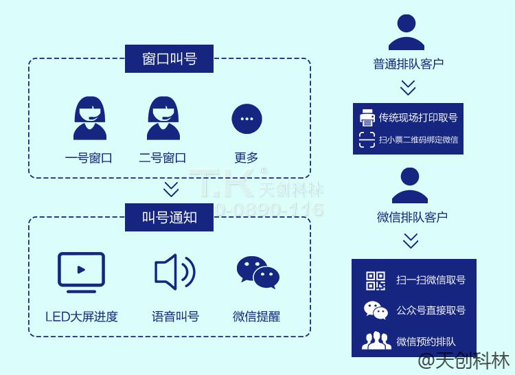 天創科林排隊叫號系統,讓客戶不需要到現場,只需通過微信或者網頁進行業務預約即可。